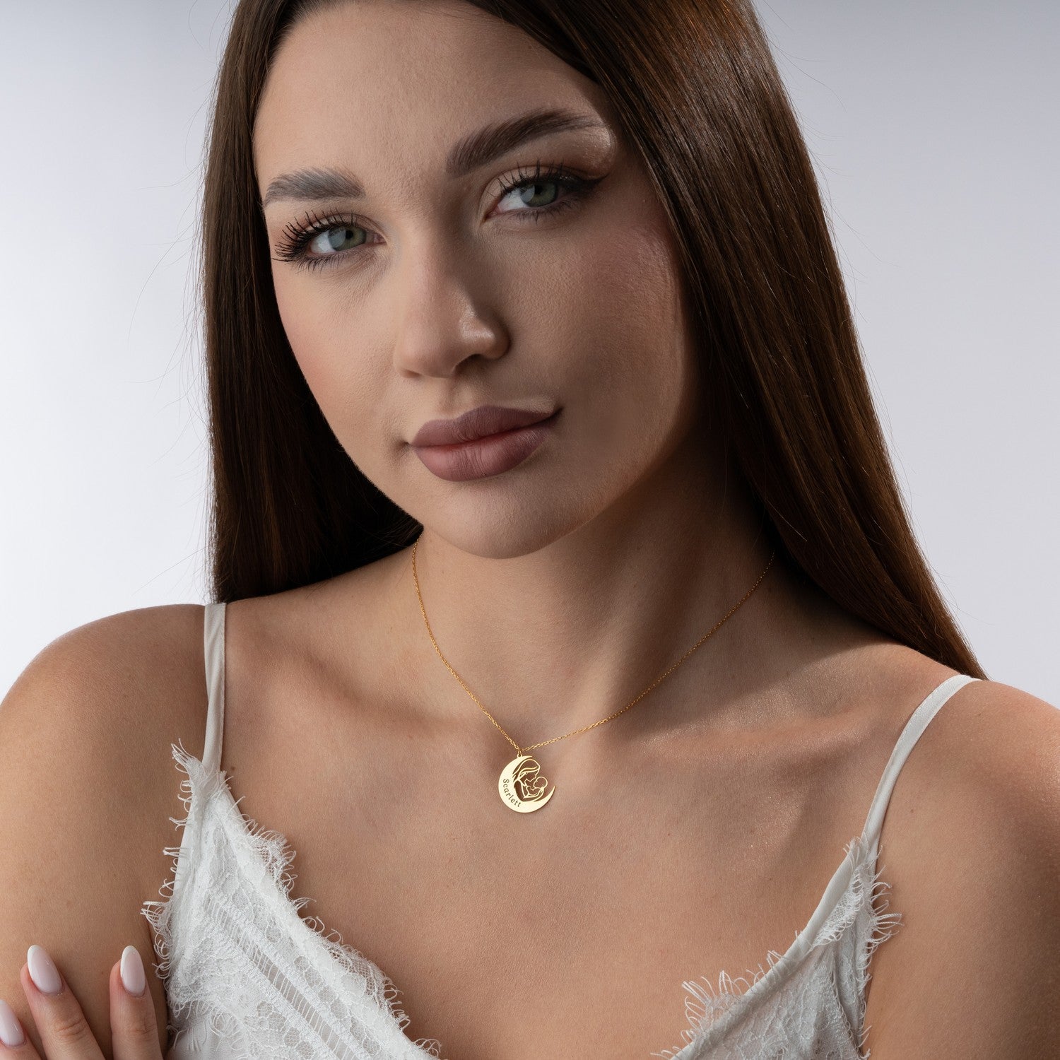 A beautiful, tender tribute to the unconditional love between a mother and her child. This elegant necklace features a crescent moon cradling a mother and baby in a warm embrace, symbolising protection, comfort, and eternal connection.