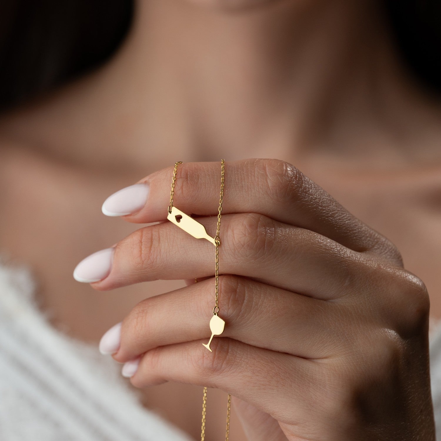 A chic, playful tribute to friendship, celebration, and the finer things in life. This unique lariat-style necklace features a minimalist wine bottle at the top, with a delicate wine glass dropping elegantly below.